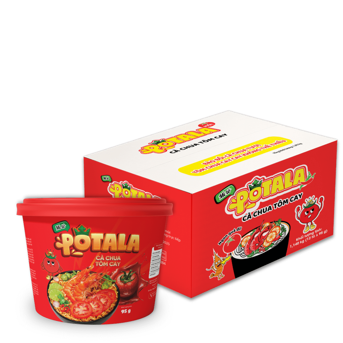 Đắm chìm trong hương vị mới lạ và đầy kích thích với mì Potala vị Cà Chua Tôm Cay – sự kết hợp hài hòa giữa vị chua thanh mát của cà chua chín mọng và vị cay nồng hấp dẫn của tôm đậm đà. Sợi mì vàng óng, dai ngon, thấm đều nước súp sánh quyện, mang đến trải nghiệm ăn mì “vừa lạ vừa quen”, ngon đến giọt cuối cùng.