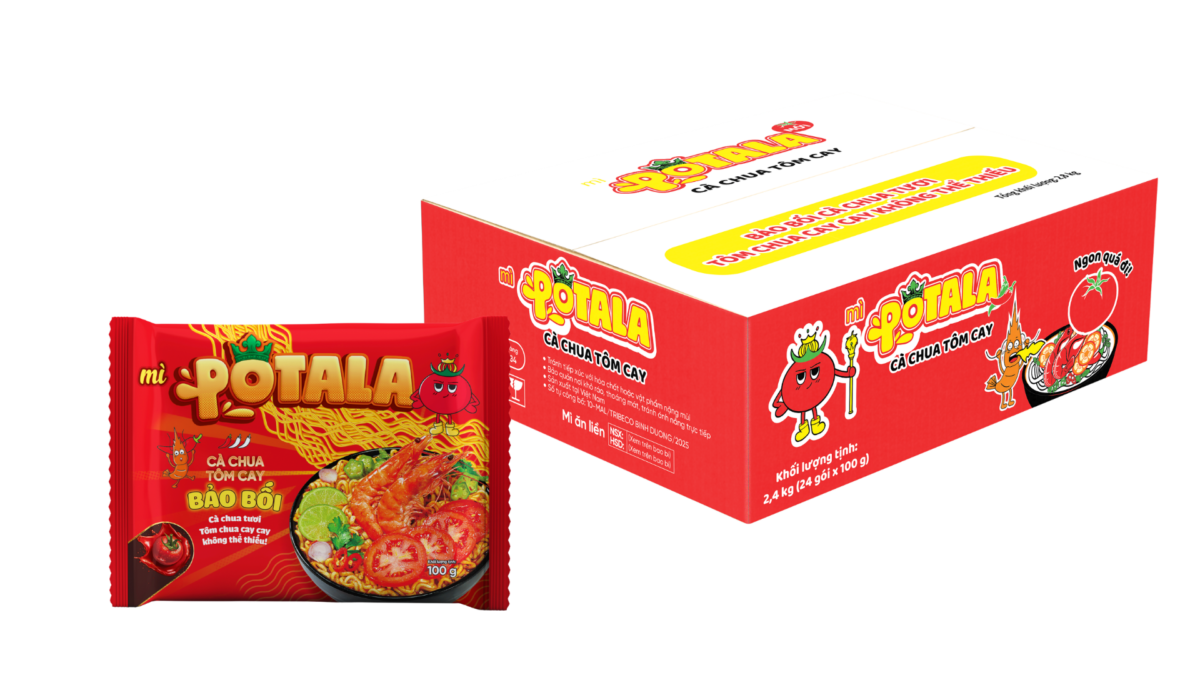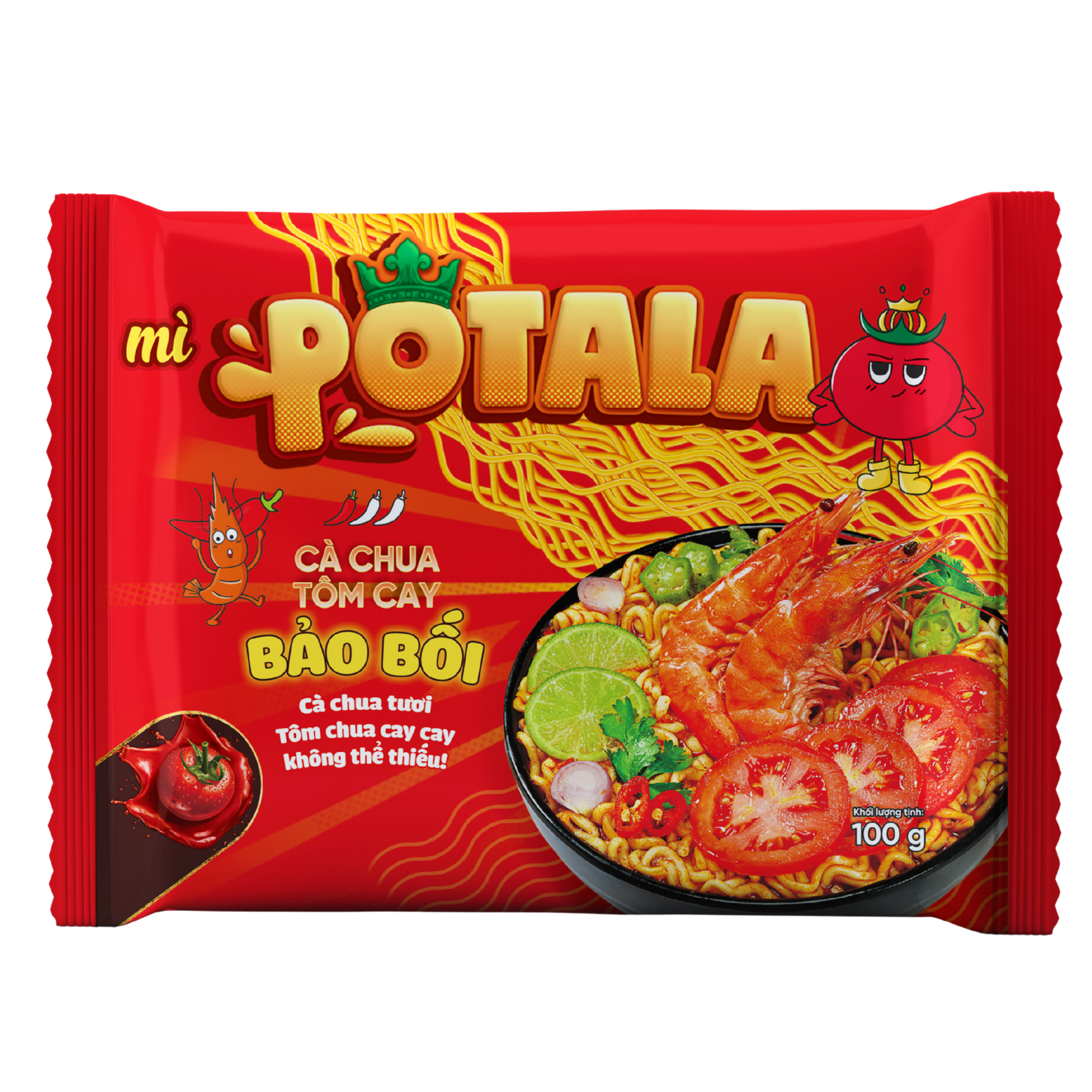 Các gói gia vị: Cà chua dạng sệt (60 g/kg), nước, đường, muối, dầu cọ, cà chua tươi (20 g/kg), rau sấy (cà rốt, hỗn hợp protein sấy vị tôm, hành lá), chất điều vị (621, 627, 631, 364(ii)), bột gia vị (cà chua, tỏi, hành tây), tương ớt đậu, nước mắm, hành tím, ngò gai, bột ớt (6 g/kg), tỏi, bột tôm (3 g/kg), chất ổn định (415, 1422), bột chiết xuất gà, chất điều chỉnh độ acid (330, 270), hương liệu tổng hợp, đạm thực vật thủy phân, chất chống đông vón (551), chất tạo màu paprika oleoresin tự nhiên, chất bảo quản (202), chất tạo ngọt aspartame tổng hợp. |
